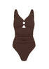 Kostium kąpielowy Mykonos w kolorze czekoladowym to strój, który pięknie podkreśla kształty. W okolicach brzucha ma marszczenia, między piersiami znajduje się obszyte materiałem, ozdobne kółko a charakteru doda mu wiązanie na plecach. Dodatkowy komfort użytkowania zapewniają szerokie ramiączka, które są regulowane.