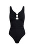Prążkowany kostium kąpielowy Mykonos, w czarnym kolorze, który pięknie podkreśli Twoje kształty. W okolicach brzucha ma marszczenia, między piersiami znajduje się obszyte materiałem, ozdobne kółko a charakteru doda mu wiązanie na plecach. Dodatkowy komfort użytkowania zapewniają szerokie ramiączka, które są regulowane.